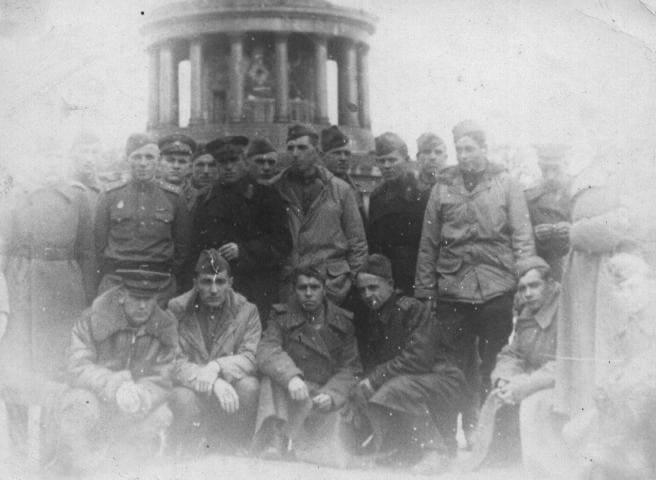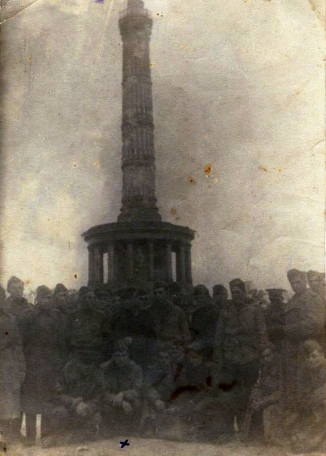 Снимок у арки Победы в Берлине. 02.05.1945. Коржов В.Г.отмечен
