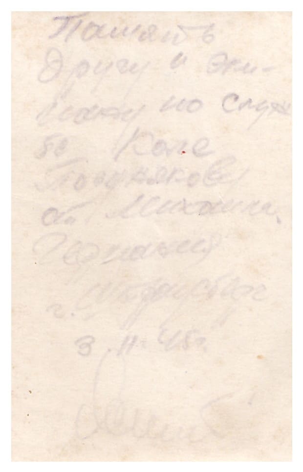 Это где-то в апреле сорок пятого написано. Я писал ребятам, но сейчас трудно вспомнить. Вот это стихотворение случайно -осталось. Есть и еще. Недавно в - Ленинской библиотеке, в газетном фонде, удаюсь найти свою небольшую статейку опубликованную в "Красной Звезде". Надо будет заказать фотокопию и взять на память. Вот какая просьба будет, дорогой Владимир Кузьмич. Я хочу подсобрать материал о буднях полка. Здесь все будет меня интересовать. Каждая фотография, каждая бумажка. Кемаль Байрамович говорил, что дома у него имеются карты. (Свою, я к сожалению, куда то задевал), Игорь Корчмарик обещал фотографии, в альбоме у Володи Евстигнеева тоже кое что найдется. Словом, с миру по нитке, голому рубаха. Так вот просьба в связи с этим такая: если есть какие либо интересные фотографии, - подумай, какие из них можно отправить мне. С ценных для Вас я сделаю репродукцию и перешлю оригинал обратно. И вот еще что: наверняка в доме у вас есть Ваша личная фотография. Желательно хорошая, не любительская- подарите мне ее. С дарственной надписью. Как товарищу по полку. Ома найдет достойное место в моем альбоме. Я хочу потихоньку собирать и потом писать. Тема войны - это долгая тема. Будем писать, пока живы., а нас к сожалению, остается все меньше и меньше с каждым годом. Договорились, Владимир Кузьмич? Ну и хорошо! ... Теперь вот что. Помнишь я приносил фотографию для опознания ребят.- Нас там было четверо в лодке. Первым сидел я, затем Паша Князев, а следующих двух узнать не могли. Это я репродукцию приносил. Дома, с оригинала осторожно снял альбомную наклейку с внутренней стороны, промыл снимок и вот что прочитал! Буеверов Рэм, 2. Князев Паша, 3. Козин, 4. Лебедев. Германия, г. Нойдам, Апрель, 1945 год. Помнишь таких - Козина и Лебедева? Георгий Булочкин! говорит, что был такой штурман - Лебедев. А Игорь Корчмарик предполагает, что Козин - это адъютант полка. По-моему, это не так. Я помню адъютанта. Это не он.